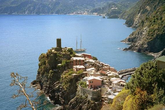 The remains of an ancient medieval castle and defensive walls – built in the 15th century that once protected the village from from Saracen pirates invaders out of North Africa can be seen perched on top of a cliff overlooking the sea. The medieval castle lookout tower gave the village its historical heft which is missing from some of the other Cinque Terre towns (Vernazza has been a stronghold since at least AD 1080, the likely launching point for a fleet fielded to defend this stretch of coast from Saracen pirates out of North Africa). The Italian Riviera coastline is a spectacular view from the castle.
