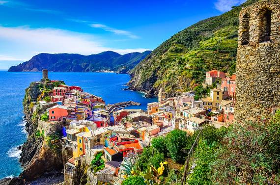 Vernazza, one of the five stunning coastal towns in the Cinque Terre national park, located south of Monterosso al Mare that juts out into the Ligurian Sea, north-east Italy. The Italian Riviera town of Vernazza is certainly one of the prettiest communities in Liguria Italy the one that appears on all the postcards. Vernazza is a very popular tourist destination on the Italian Riviera and an excellent location for walking paths, and are therefore popular with hikers and those who like walking tours.