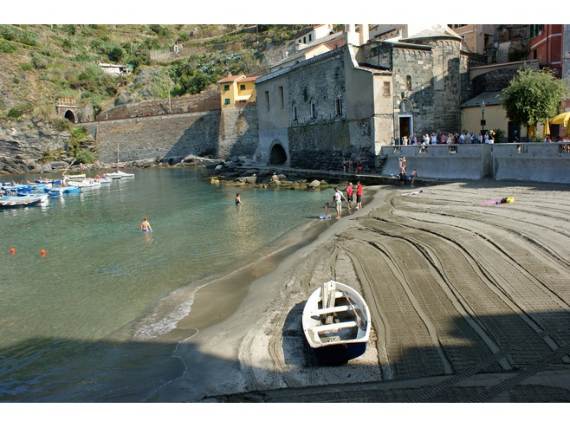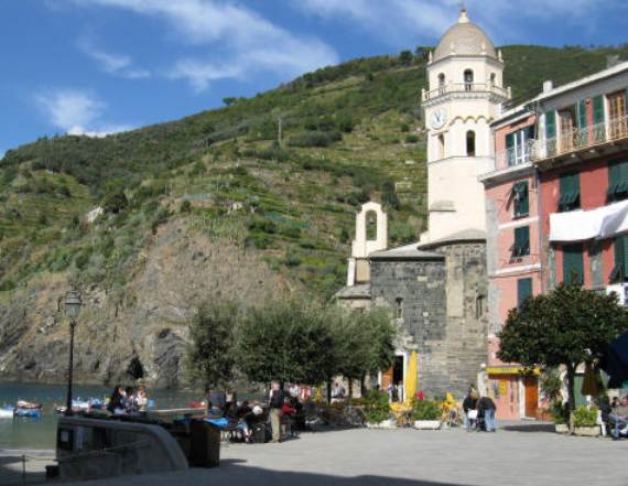The main square in Vernazza Italy is situated next to the community’s lovely black sandy beach and a small boat harbour filled with the boats of local fishermen.