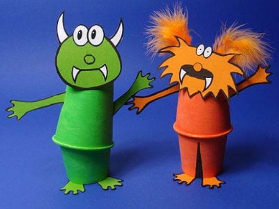 These funny and easy monsters are made of paper cups. You can paint the cups or buy them colored in advance. Stick the paper face and hair made of felt or other fabric or colored paper to them. Have fun with the monsters!