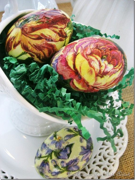 Floral Easter Egg Decal Art is clip art egg decals using tattoo paper. The technique is done by printing them on inkjet temporary tattoo paper then sticking them on the boiled eggs. The temporary tattoo paper floral designs are trimmed well removing all the excess around the edges of each, and then place the decal on an egg. For more instruction see the link under the image.