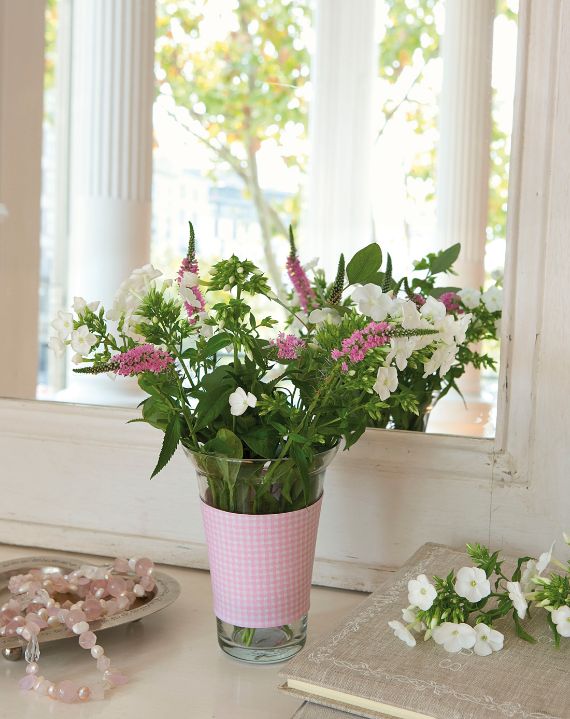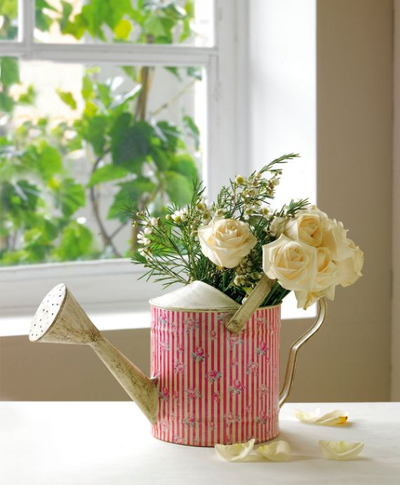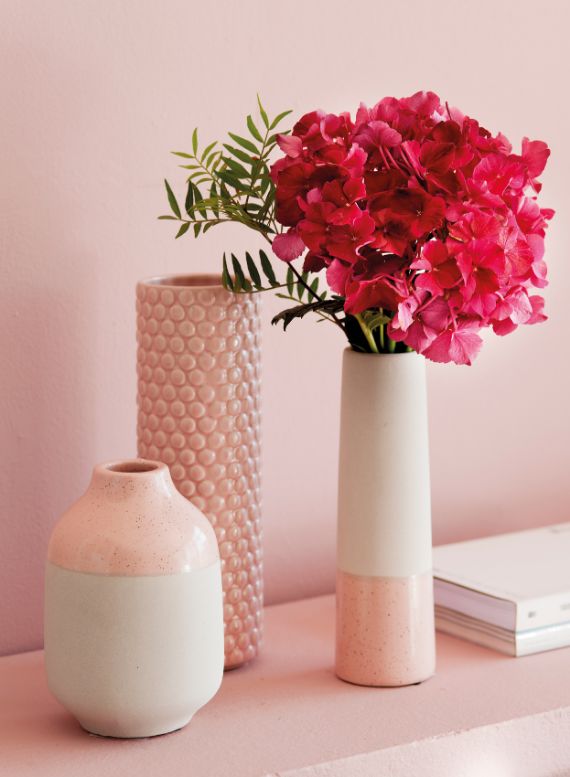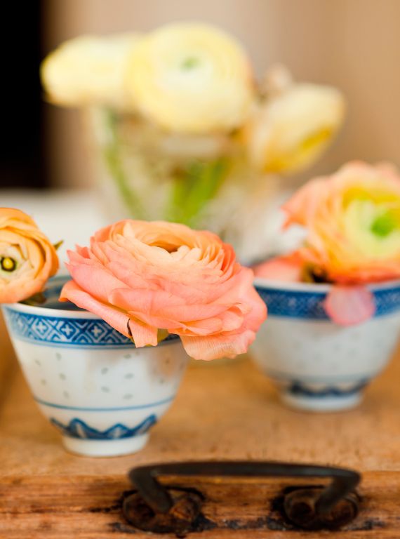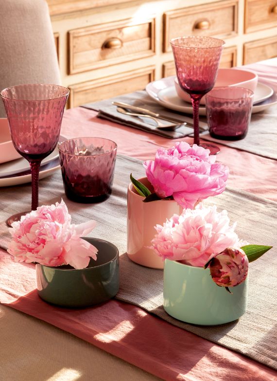 Instead of placing a bouquet in a single vase place a single pink peroneus in 3 different colored containers a single flower in each to symbolize your happiness in 3 different steps. Playing with the colors of the vases and tablecloths and the floral arrangement will have a deep impact, as that with the pink and green tones.