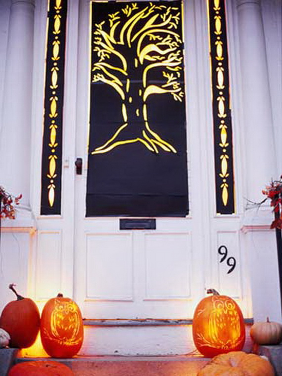 Simple jack ‘o lantern door…For a fresh take on an old classic, simple jack ‘o lantern door decorating is fun from Women’s Day. A No Carve Pumpkin Decorating Idea that is elegant, yet whimsy and will enhance the look of your door this fall. Funny faced jack-o-lanterns made from glitter paper is simple and so cute. Add the quintessential look of a jack-o-lantern to your front door that will appeal to kids and adults alike.