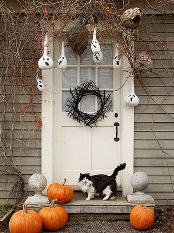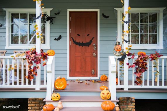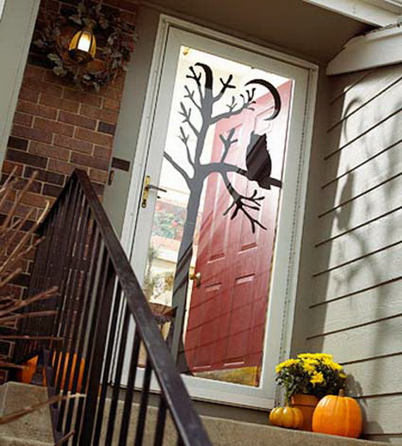 A simple way to add Halloween to your door is to hang a sway of leaves, wrapped candy, plastic bugs, little skeletons, etc. … spooky to whimsical and from simple to more elaborate above your door. You could add lights to your sway. There are many ideas for Halloween decor for your door. Any how any Halloween theme you choose will work for this occasion.