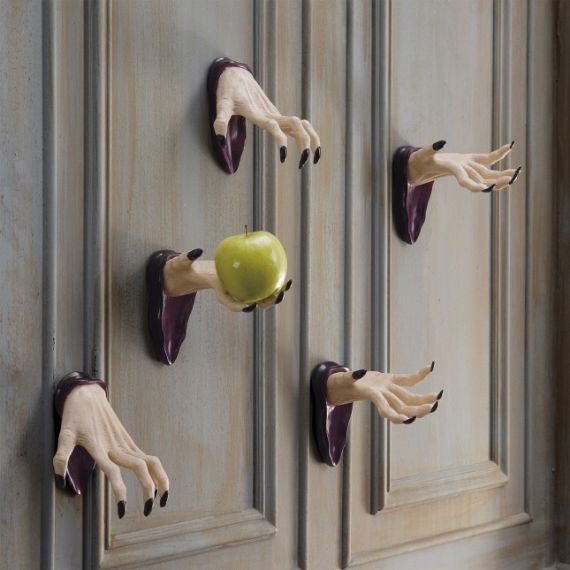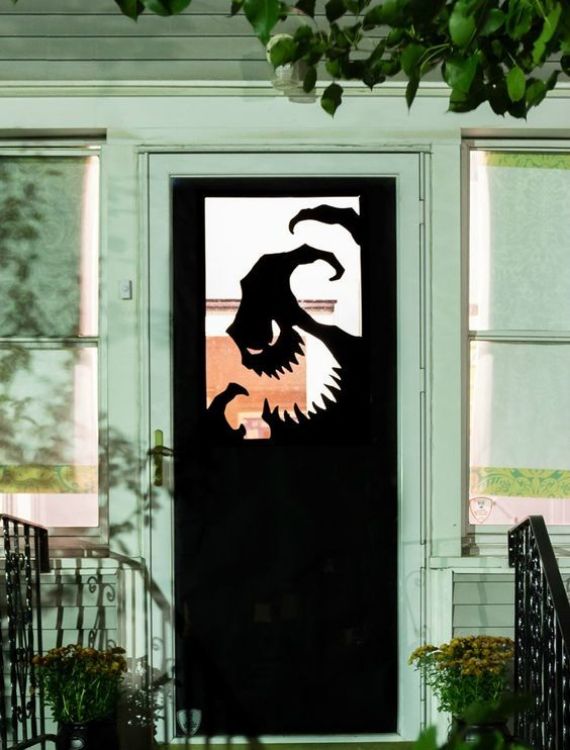 Halloween door decor ideas with the use of a witch hat or even hands to create a spookily atmosphere with witches are whimsical decoration ideas. The secret is to create a hint of something sinister lurking just underneath the surface. Fill this witch’s hat with a variety of different dark color artificial flowers, add a few plastic black small spiders or rats to give this witch’s hat a creepy touch.