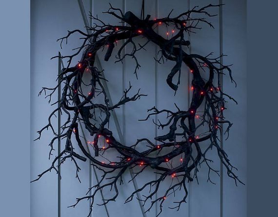 We knew that fall wreaths were a thing, but who knew Halloween wreaths could be something frightening yet architectural, go black. So, as the seasons change, replace your fall wreath for upcoming holidays. Being a Black Halloween Wreath, it will withstand many Halloweens and give your home a spooky look. Black branch wreath does the trick, while adding to it string lights to cast a night-time glow and giving an eerie feel. While the season comes more timely switch it out for something more welcoming for Thanksgiving, or for Christmas in red and green shades.