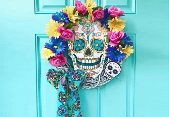 If you’re looking for a creative and festive wreath… a non-scary Halloween wreath for a Halloween theme, sugar skulls are the perfect fun and colorful wreath ever. Because it is often surrounded by vibrant flowers, favorite bright and bold colors, sugar skulls add Halloween charm. A Nice large Halloween wreath DIY is great for a front door and full of personality. From far away it will attract young trick-or-treaters as they will be delighted by one greeting them at the door. Sugar Skull Themed Halloween Wreaths are so cute and great enough to leave the scary stuff for the neighbors.