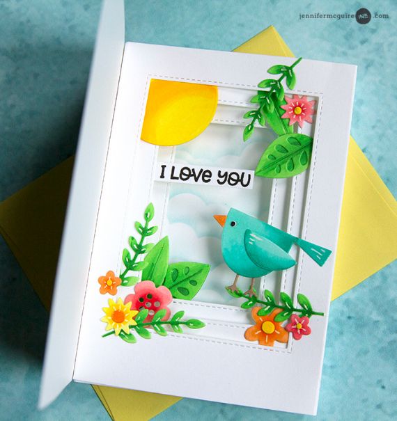 This is one of the cards that I liked so much. Building the card depends on layering inside the shadow box. The cards are so cute, very simple and surprising too. You can follow all the details through this link.