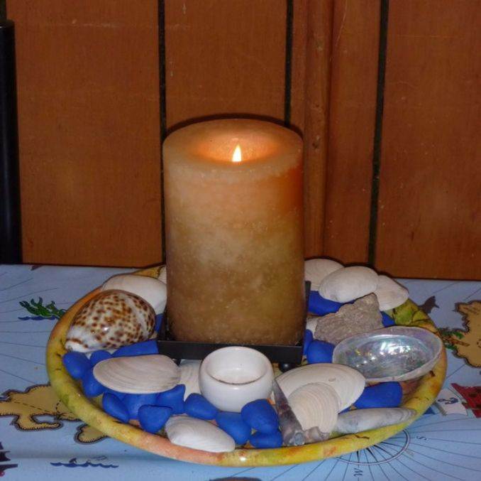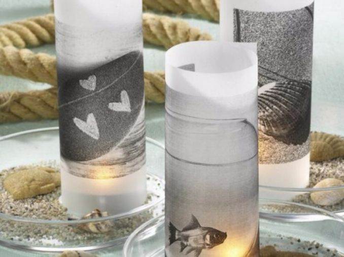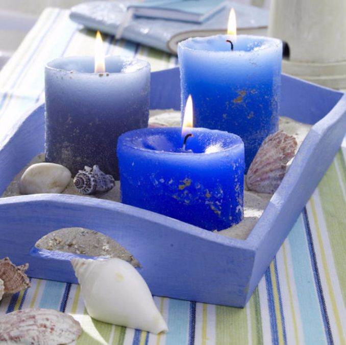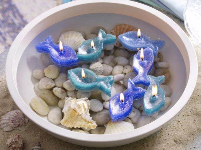 Marine theme candles create a beach, or ocean display for your home décor. A combination of blue, blue and white colors of beach, or ocean element such as Shells and sand, starfish and pebbles, fish and boats, surrounded by candles and create a unique artistic atmosphere. Each features the calming influences of the ocean.