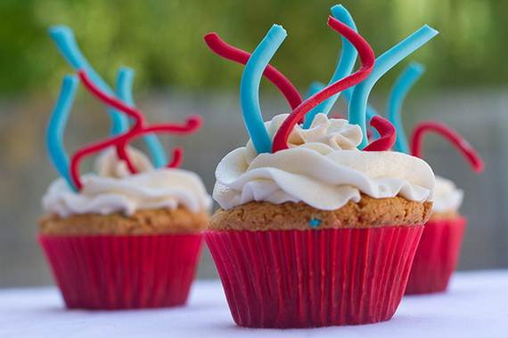 The possibilities are endless for fun three rainbow colored cupcakes for your Fourth of July cookout. Red, White and Blue Cupcakes may be with layered colors to bring out everyone’s patriotism or Red, White and Blue Poke cupcakes.
