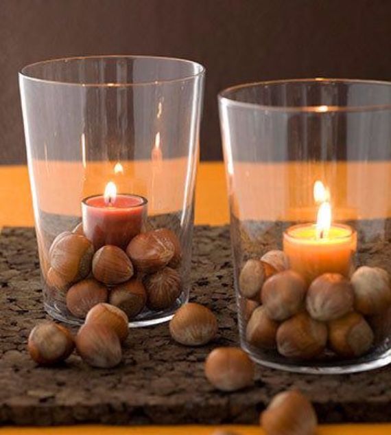 Candles in silver or gold colors in candle holders add a sophisticated and elegant touch to your thanksgiving table. Accompany the candles with arrangements of wonderful still life dried decorative branches, your table will look spectacular. Add warm tones of green leaves or fresh branches to contrast with your colored candles to shine on your table.