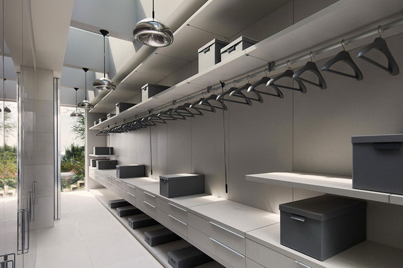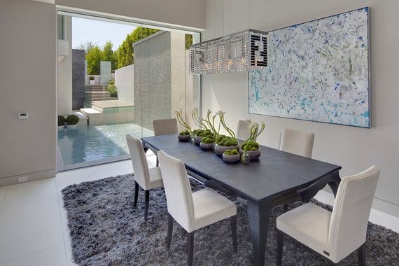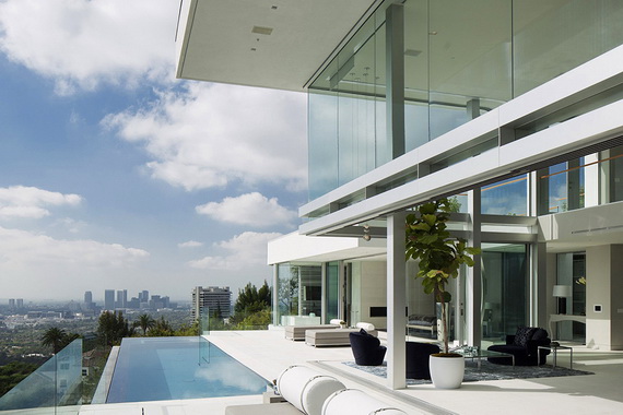 Living space of the house is divided into three levels; the sophisticated contemporary house was imagined for both social entertaining and private relaxation. The first floor is reserved for bedrooms (leaving the master bedroom to occupy higher grounds, on the main level). A home theater, gym and wine cellar were also designed. The main level consists of a designed hallway, two-level dining room, kitchen, master bedroom and a terrace lounge with infinity pool. The third level a loft space is occupied by additional bedrooms creates a welcoming space and a roof terrace. The pool is unique in that it has an infinity edge on four sides. The palette for the house is a typical chosen material for Hollywood: fashionable black and white combination, gloss, suede, marble and dark granite and chrome as well as high gloss cabinets and custom wall paper.” Materials used and the designed shapes were interweaved to compose an amazing modern residence.It is an incredibly large, airy and tastefully decorated space to make the owner’s dreams come true.[Images courtesy of McClean Design].