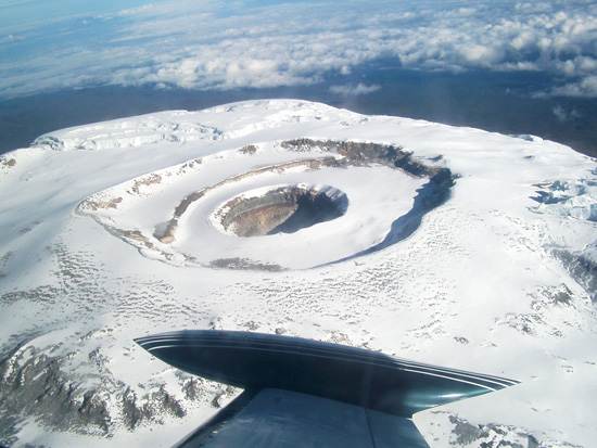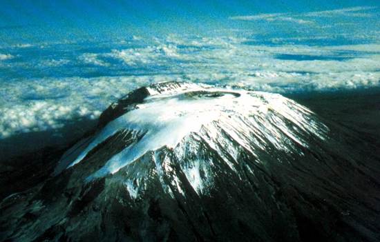 Kilimanjaro, with its three volcanic cones, Kibo 5,895 m (19,341 ft), Mawenzi 5,149 m (16,893 ft), and Shira 3,962 m (13,000 ft) is an inactive stratovolcano that began forming a million years ago. When lava spilled from the Rift Valley zone. Kibo, the central, youngest and highest peak has survived as an almost perfect cone. 205 miles south of the equator, on the border of Tanzania and Kenya.close to the Indian Ocean.The last major eruption has been dated to 360,000 years ago, while the most recent activity was recorded just 200 years ago.