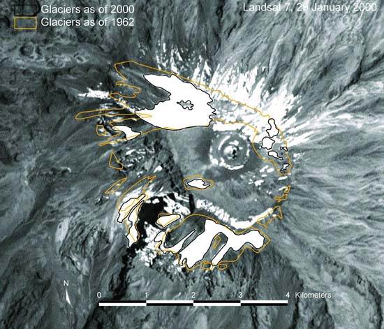 The ice cap, which formed 11,000 years ago, has retreated significantly in recent years, the period from 1912 to 2007, as much as 85% in the last century.(From 1912-1953 there was ~1% annual loss, while 1989-2007 saw ~2.5% per year. Of the ice cover still present in 2000, 26% had disappeared by 2007). Scientists expect it to be gone within the early half of the 21st Century. This current shrinking and thinning of Kilimanjaro’s ice fields appears to be unique within its almost twelve millennium history. Mount Kilimanjaro, the highest mountain in Africa, now attracts many thousands of walkers each year.