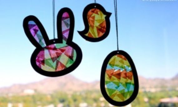 Easter suncatchers are DIY Colorful fun craft activity for all ages. Easter suncatchers will decorate the windows and illuminate the room with fun Easter theme shapes! Bright and cheerful Easter suncatchers in the shape of Bunnies, flowers, Easter eggs and chicks can be hung outside to brighten up any room as long as there’s some sunshine. Window art Easter suncatchers may be made from card stock, colored tissue paper and stained glass suncatchers, these are an inexpensive craft that’s easy for the kids to do.