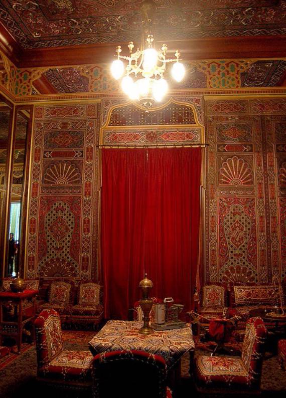 It was the work of architect Charles Lecompte de Nouy, having the most expressive North-African and Spanish-Moorish elements such as Oriental weapons and armor, a complete indoor Carrara marble fountain, replica of a similar piece in Cairo, mother of pearl inlaid furniture and Ottoman Isparta rugs.