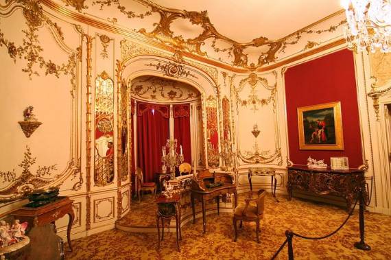 Another spectacular room from the Peles Castle; was executed under the guidance of the French architect André Lecomte du Nouy in 1890 and 1892. It was created in the Hispano-Moorish and North-African interior style reminding of the Alhambra Palace from Granada, Andalusia. Mother-of-pearl inlaid furniture, marble fountain indoor salon Chandeliers in a minaret shape, fine Persian Sarouk and Ottoman Isparta rug made in oriental style and on the walls oriental weapons and armor from the collection of the king which perhaps are the most expressive elements.