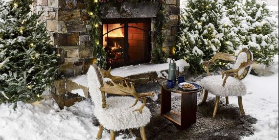 Your outdoor fireplace deserves a cozy outdoor hangout. The same treatment as that done indoor, Christmas outdoor decorations should reach your outdoor fireplace too. Deck it out with a garland with lights lit up… The chimney Christmas lights are very subtle. A pair of white sheepskin-covered moose-antler chairs are a nice touch during the Christmas season.