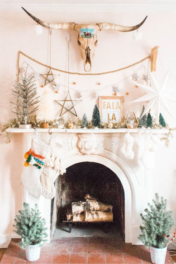 Christmas decor doesn’t have to be all traditional colors; red, white and green. You can stay on trend with lot of lights and garlands draped this Boho Christmas Mantel Decor Ideas! Get the tutorial at Hey Wanderer.