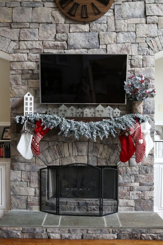 This is How to Decorate a Mantel with a TV Above It for Christmas…Christmas decorating mantel with tv above is a challenge because some people just love the TV above the mantel. This “home for the holidays” made a great way having a Christmas mantel with tv and pretty decor, too! Mantel with tv above Christmas decorating ideas are many but here a lovely example of a silver Christmas village made of paper chipboard surrounded by glittery garland and pops of red. Christmas fireplace decor with tv is totally possible to keep the holiday cheer and gorgeous home décor.