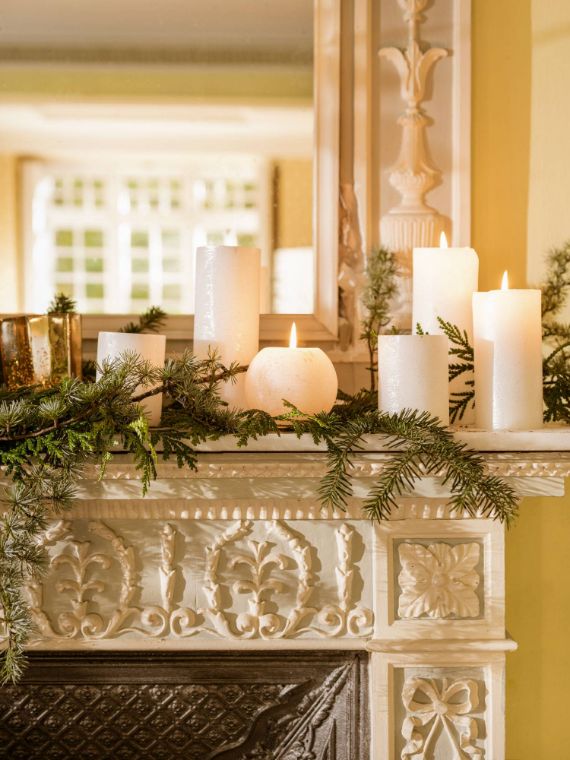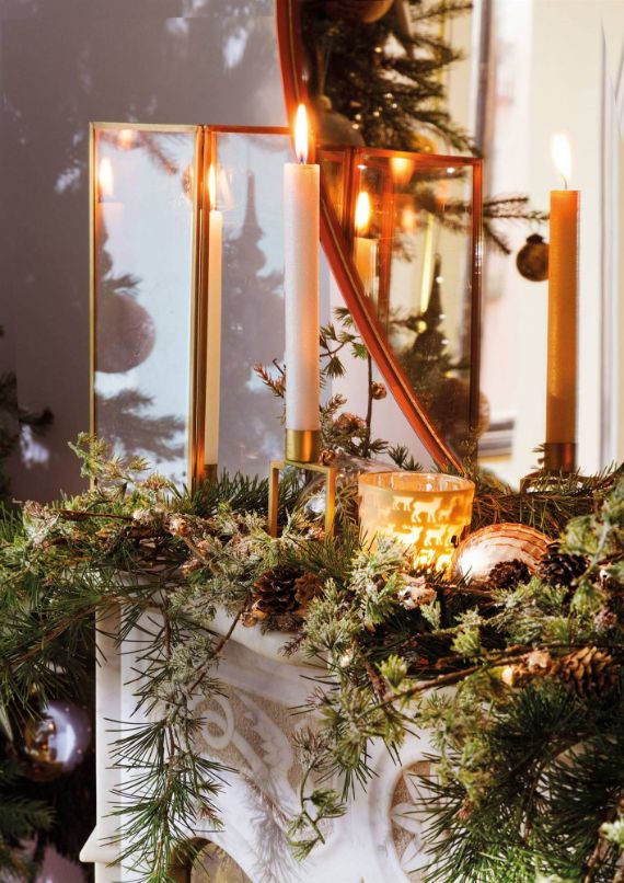 In fact, candles perfectly fit any Christmas mantel as they are like icing on the cake. On top of the shelf, along with other evergreen garland for mantle with lights gives them the leading role and a gorgeous Christmas fireplace décor.