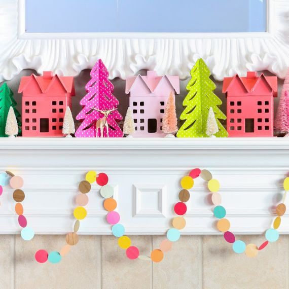 Add DIY decorations to your home. Transform a neutral mantel into a colorful and fun Christmas mantel featuring DIY colorful wood veneer garland. An easy colorful wood Christmas garland DIY made from bright garland, bottlebrush trees and Christmas village houses. Get the tutorial at A Kailo Chic Life.
