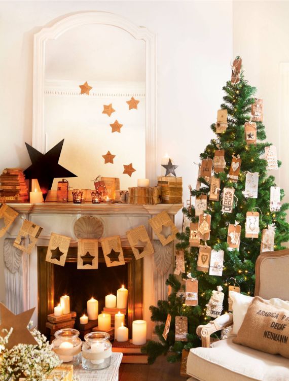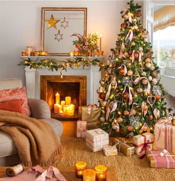 It is an ideal Christmas picture. Fireplace is a best spot for Christmas trees, and other Christmas decorations like stockings, Christmas gifts…etc. DON’T stop decorating your Christmas tree beside the heat of the fireplace. It is not too harmful to the tree if natural or artificial. Enjoy the Christmas garlands with Christmas lights for fireplace and many candles for your Christmas decoration.