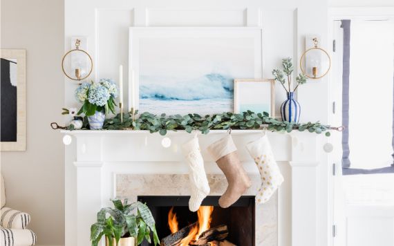 A rethink design of the mantel with touches of winter greenery, brass and blue. These simple holiday additions gave a beautiful coastal vibe to create a “mantle magic” that sets the festive mood.