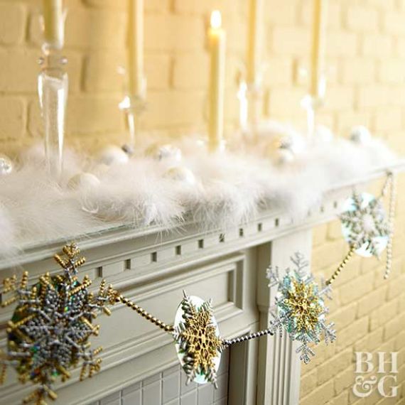 Sometimes less is more! A simple strand of white garland snipped on the mantel giving a snowy appearance. Adding glitter snowflake ornaments gives a sparkling display and have a beautiful festive focal point.