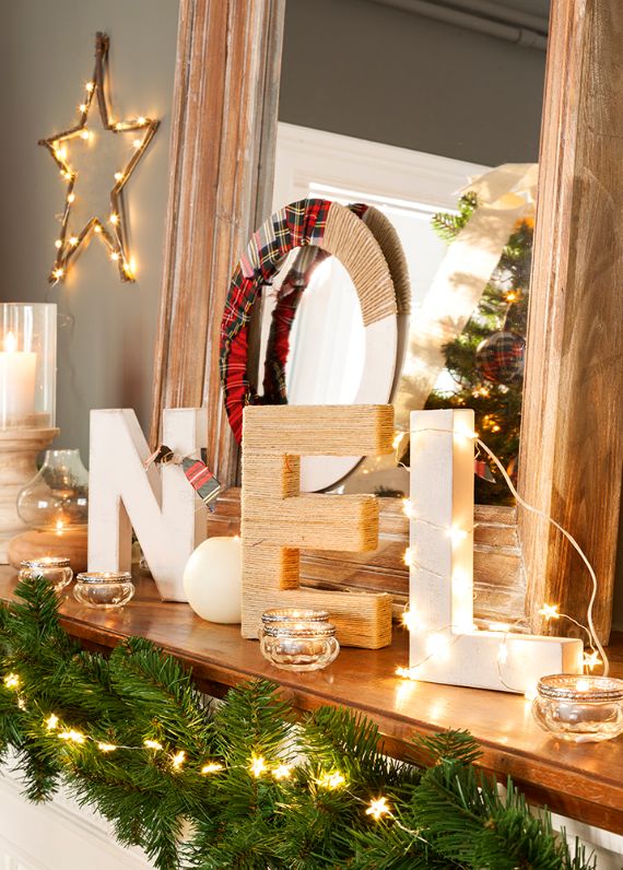 Transform your mantel into a modern glamour focal point using “Joy” in gold letters. A seasonal festive message for Christmas that cap things off. Build your mantel with gold-sprayed foliage, ornaments, Christmas garland for mantle with lights and a mix of big boldly colored baubles.