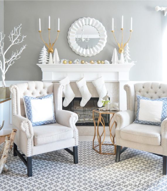 Layering the mantel with white and gold decorations style adds to the calm mood. Decking out a mantel for Christmas with winter white makes decorating easy for instance, use white ceramic trees, white snowflake garland and gold bulbs trick out this display by Kate at Censtational Style. White quilted stockings are cherished heirlooms hung on the mental to give this mantel a holiday feel.