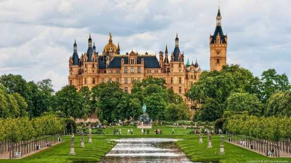 The city of Schwerin; Northeast Germany is pressed on every side by a multitude of lakes and is the capital of Mecklenburg-Vorpommern state. The city of Schwerin is oldest city in Germany where the romantic fairy tale fortress excites. This romantic fairy tale fortress; one of the loveliest in Germany, where all is beauty and elegance and its many towers, domes and wings, is reflected in the waters of Lake Schwerin -The jewel of Lake Schwerin. Set in a romantic picturesque location on a small island that is connected to the continental part of Germany via two bridges on the city’s main lake; Schwerin Lake. Schwerin Castle (The jewel of Lake Schwerin) is one of Europe’s beautiful and most foremost examples of historicist architecture of Romantic Historicism.