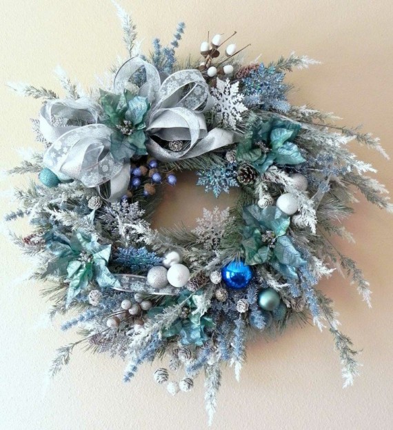 This wreath is ideal for those who want to get out of the norm, bet on soft and gorgeous colors in shades of blues and aqua with wonderful silver accents. A wreath that is glazed with silvery blues. This wreath combines inviting natural element as grasses and thistles with metallic snow stars and gorgeous ornaments. Can stand out for different sizes and elaborated of it with different silver textures.