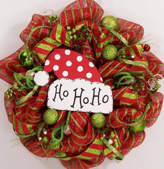 It is created on a wreath work form using red and green four different premium wired ribbon fabric. The middle supports a green wooden sign of Santa hat saying Ho Ho Ho. For a longer life display your wreath in a well-protected area… NO direct sun and moisture if hanged on a porch or on door so you can enjoy it for years to come.