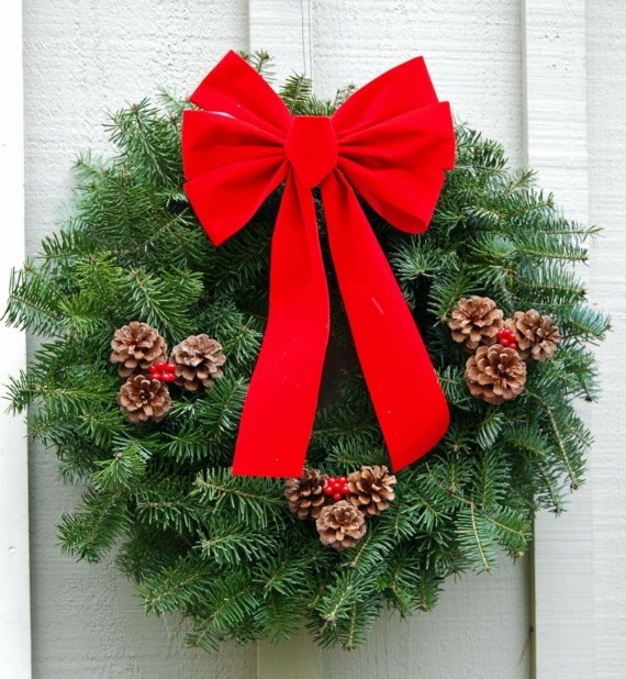 Old Fashion Christmas wreath which is one of the simplest and classic wreaths that be found at Christmas. The traditional colors of Christmas are represented in artificial pine green leaves with pine cones and a red ribbon. This simple red Christmas Wreath Designs is a front door wreath that could be hanged up for the Thanksgiving holiday and all the way through Christmas and all winter long.
